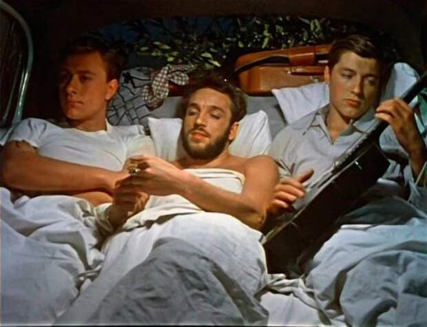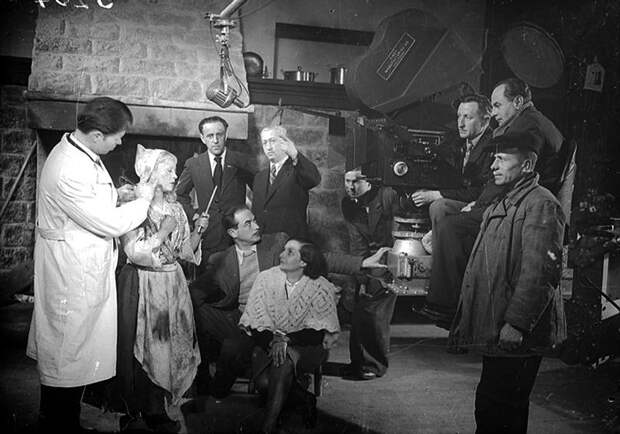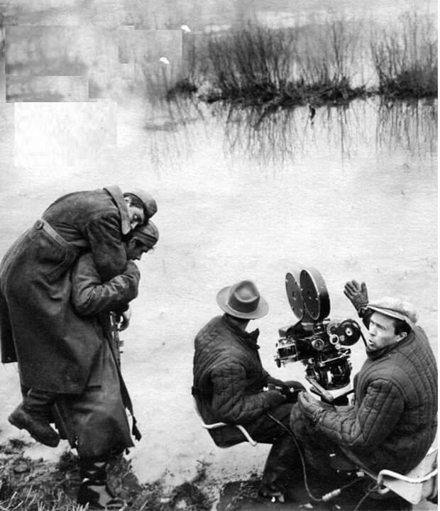За камерой оператор-постановщик Сергей Урусевский (повернулся лицом) и второй оператор Николай Олоновский. Рядом, замерли в ожидании актеры Алексей Баталов и Константин Кадочников.