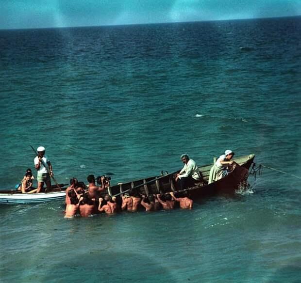 Режиссер хотел, чтобы лодка эффектно раскачивалась на волнах. Пришлось звать на помощь всех крепких мужчин из съемочной группы.