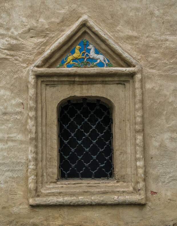 Солнечные часыОднако оно сохранило некоторые черты прежней постройки — трехчастное деление с островерхими башенками, солнечные часы, барельефы с фигурами льва и единорога над воротами.