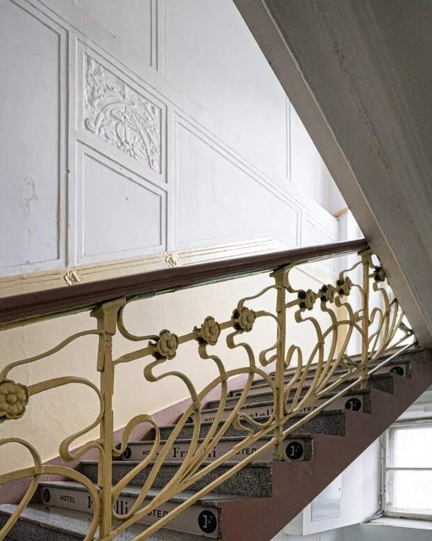 Внутри на лестничной клетке строения 2 сохранился нежный рисунок ограды лестницы, повторяющий рисунок лестницы строения 1, и лепнина в стиле модерн.