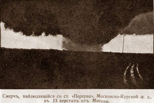 От точки съёмки до вихря - около 4-х км.Наблюдатель на станции Бирюлёво, которая находилась в километрах пяти к западу от вихря, сообщал, что в 4 час. 20-27 мин. там был сильный град, тучи шли полосой, местами в виде гор, а на востоке – северо-востоке была видна черная бесформенная масса, прорывавшая нижний слой и падавшая на землю в виде дыма.