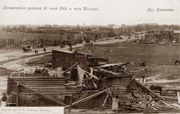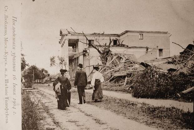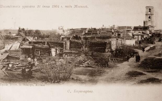"Московский листок" продолжает:"Между тем, смерч делал свое дело. Обогнав поезд, он с особенной силой начал бушевать от ст. "Перово", где сорвал несколько железных зонто-образных крыш с громадных нефтяных баков, а также с механического завода Дангауэр и Кайзер. В близлежащем селе Карачарове снесло купол с церковной колокольни. Около ст. "Сортировочная" 6 товарных вагонов, стоявших на запасных путях, были повалены на бок."
