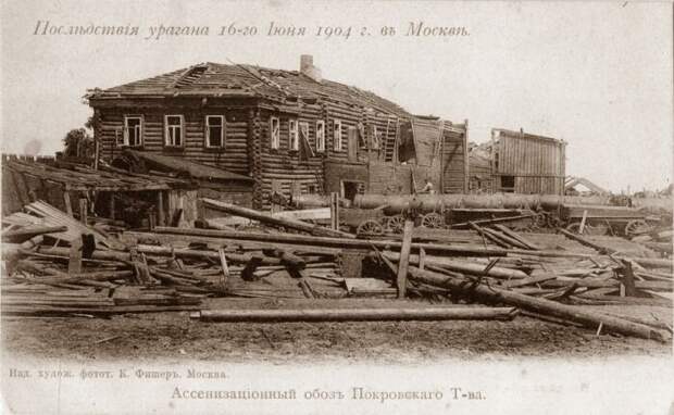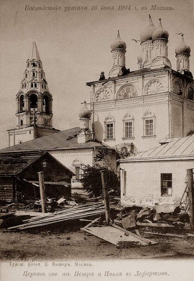 "В Лефортовской пожарной части часовой заметил торнадо и принял его за пожар. Обоз уже был готов выехать, как налетел ураган, подхватил пожарную телегу с принадлежностями, поднял и разбил ее в щепы. Было убито несколько пожарных. В Анненгофской роще на опушке леса паслось стадо. Двух коров из стада подняло на воздух, и они, вращаясь некоторое время «летали», затем были сброшены в нескольких метрах в стороне и убиты. Пастуха подняло и бросило на дерево, где он повис на сучках и этим спасся. Сильно пострадал б. Лефортовский дворец."