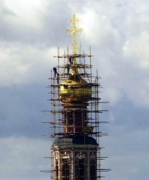 Установка нового креста (после его разрушения ураганом) на колокольне Новодевичьего монастыря, 1998 г.Ущерб от шквалистого ветра составил 1 млрд рублей. Устранением последствий стихийного бедствия ежедневно занимались более 50 тысяч человек
